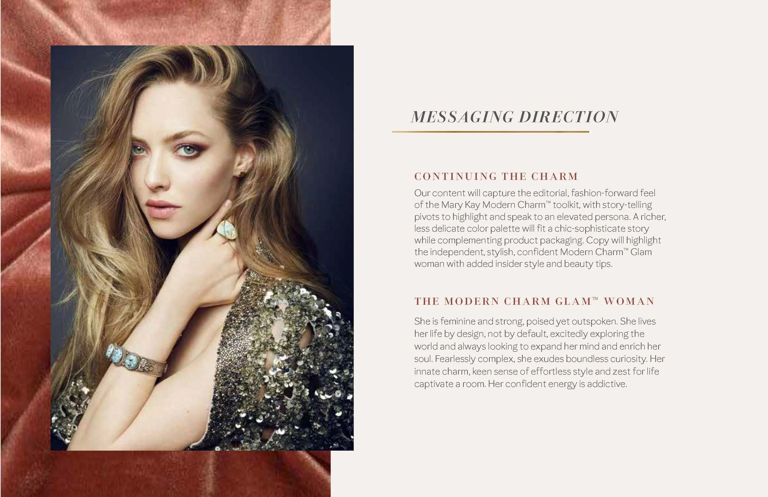 Mary Kay Modern Charm™ fragrance needed an elegant story to reveal the kind of woman that would wear it. A richer, less delicate color palette filled with powder pinks and rich lavenders will fit a chic-sophisticate story stylish, confident Modern Charm™ Glam woma.
