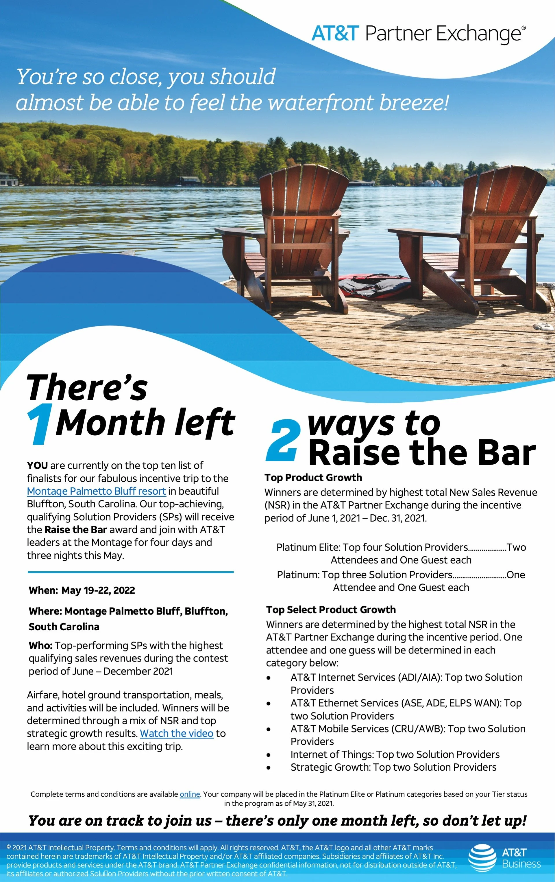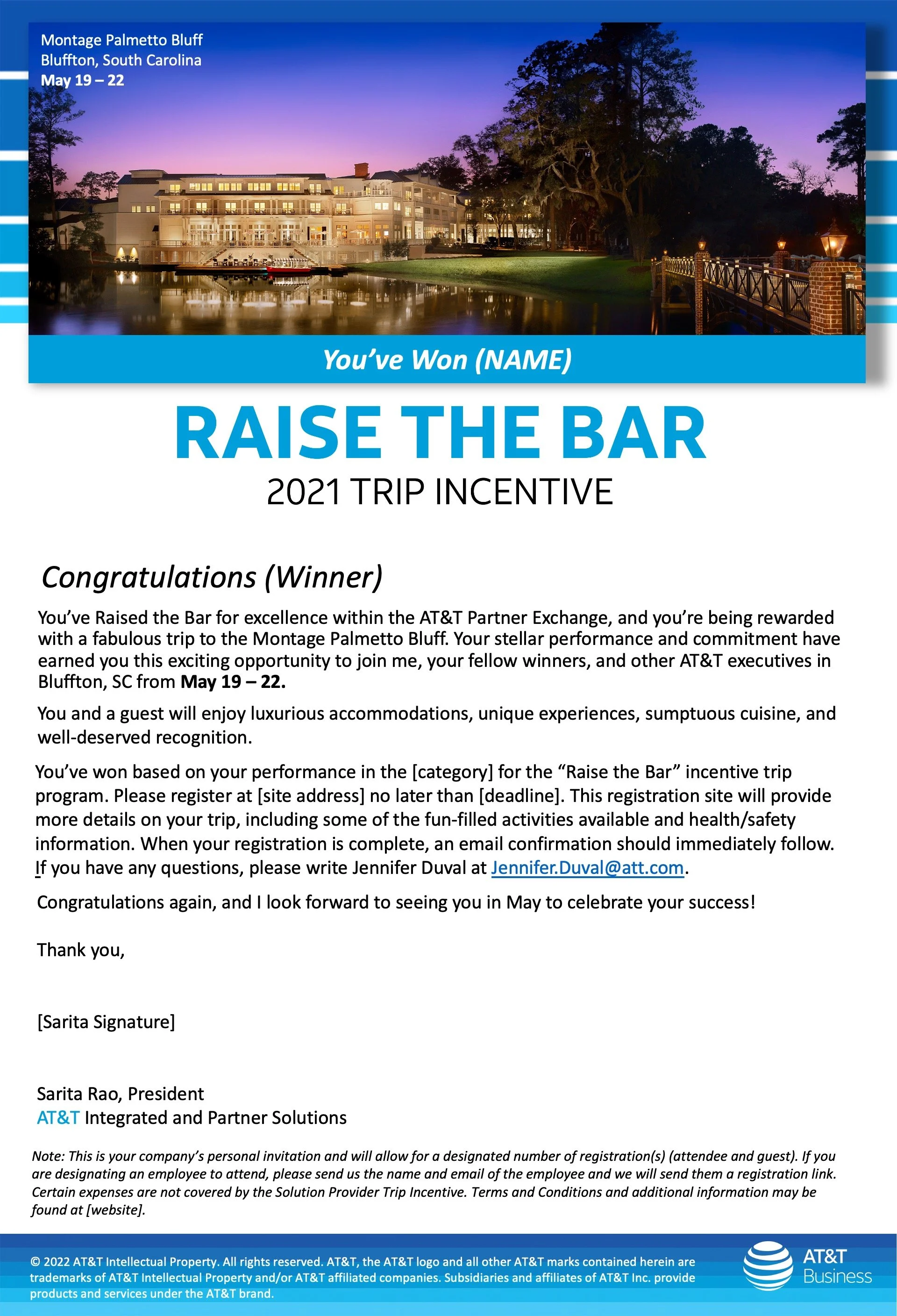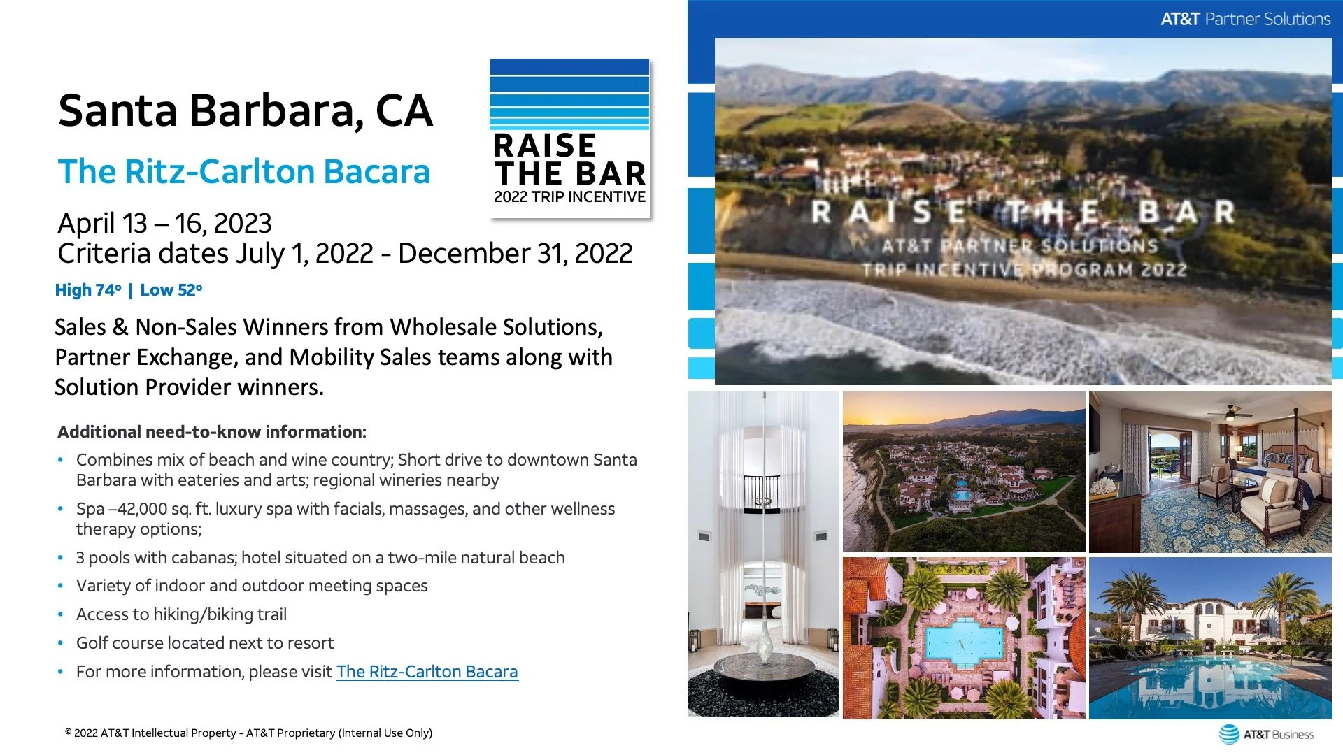 B2B marketing is all about the numbers and rewards. Rewards at AT&T are highly coveted by Sales Reps, and Solution Providers. Winners are determined by highest total New Sales Revenue (NSR) during the incentive period, get to take 4 Days/3 Nights trip to a selected all inclusive 5 star resort.