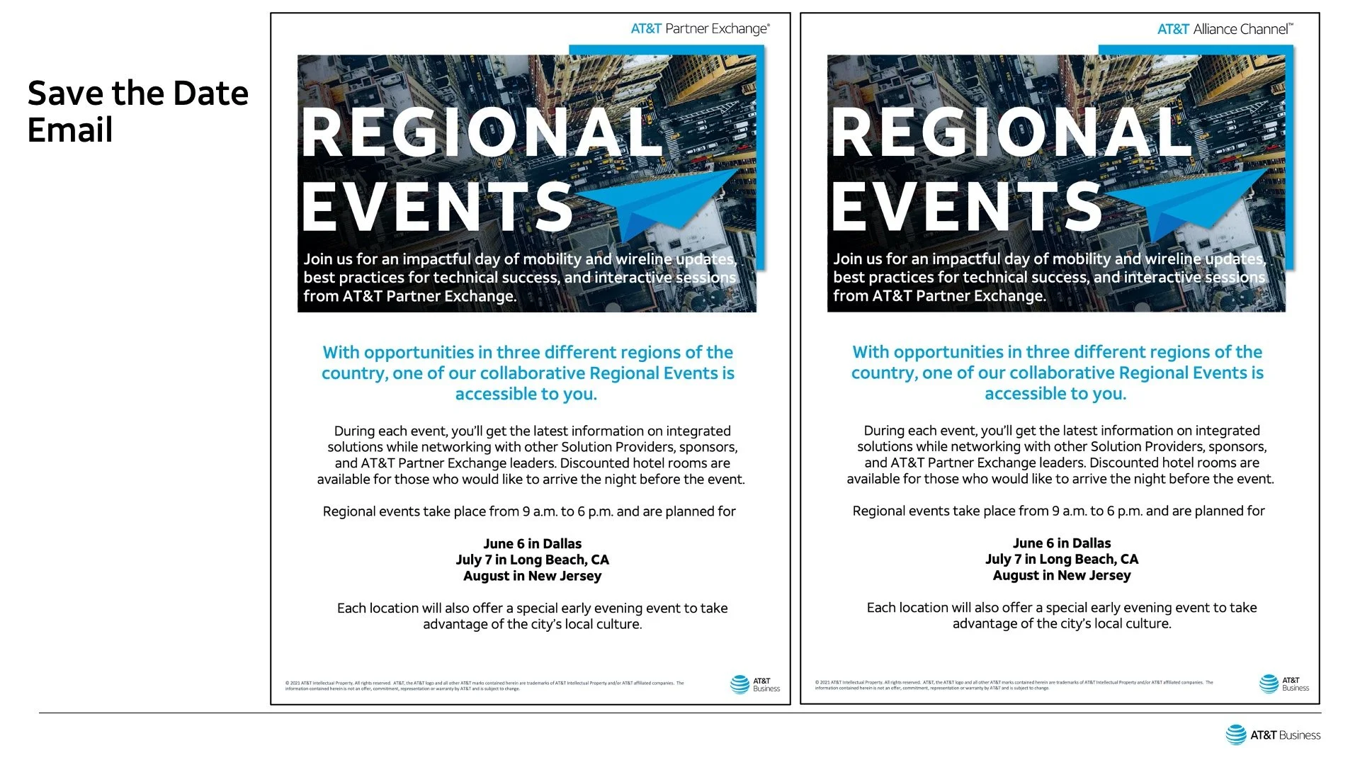 Regional Events is one of our smaller conferences where sellers and Solution providers & sponsors have a chance to network and get the latest information on our integrated solutions program and meet with our AT&T Partner Exchange industry leaders.